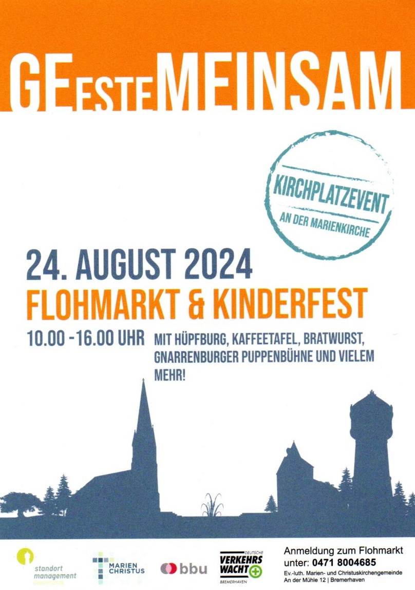 Am Samstag, den 24. August, findet wieder ein Geestemeinsam-Kirchplatzevent an der Marienkirche statt: von 10 bis 16 Uhr, mit Flohmarkt und Kinderfest, Hüpfburg, Kaffeetafel, Bratwurst Gnarrenburger Puppenbühne und vielem mehr!