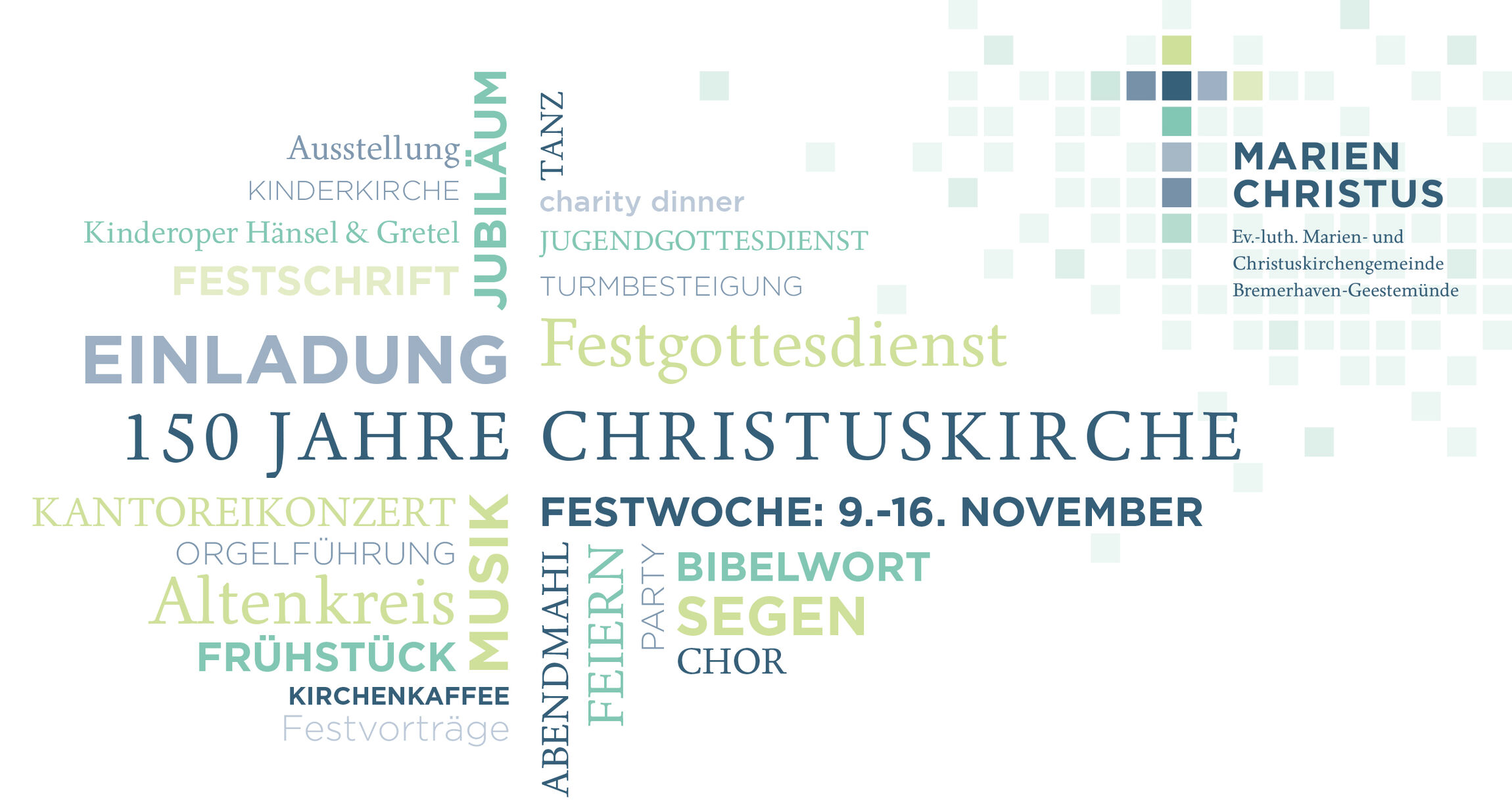 Die Einweihung der Christuskirche vor 150 Jahren begann mit einem Gottesdienst in der Marienkirche (An der Mühle), daher findet auch der Auftakt zur diesjährigen Festwoche am So., 9.11., um 10 Uhr bei einem Gottesdienst in der Marienkirche statt. Ebenfalls am 9.11. um 17 Uhr gibt es ein großes Jubiläumskonzert in der Christuskirche: Die Evangelische Stadtkantorei Bremerhaven, das Bremer Barockorchester und Solisten spielen Mozarts Messe in c-Moll. Am Montag, 10.11., wird um 17 Uhr eine Ausstellung eröffnet, die in Zusammenarbeit mit Rosemarie Blum vom Bürgerverein Geestemünde entstanden ist und die Geschichte der Christuskirche zum Thema hat. Auch die Festschrift zum Jubiläum wird bei der Ausstellungseröffnung vorgestellt. Weitere Programmpunkte folgen an jedem Tag der Woche, u.a. ein Kinderprogramm zum Martinstag am Di., 11.11., von 17 bis 19 Uhr, ein Festvortrag mit Dr. Hartmut Bickelmann, dem ehemaligen Leiter des Stadtarchivs, am Do., 13.11., um 18 Uhr, ein Charity-Dinner am Fr., 14.11., um 18 Uhr, ein Jugendgottesdienst am Sa., 15.11., um 17 Uhr und noch viele weitere Veranstaltungen. Den Höhepunkt und Abschluss bildet der Festgottesdienst am So., 16.11., um 10 Uhr in der Christuskirche, in dem die neue Regionalbischöfin Sabine Preuschoff (Stade) predigen wird. Im Anschluss an den Gottesdienst gibt es bei einem Empfang Raum für Begegnungen mit Ehemaligen und Jetzigen der Gemeinde und allen, die dabei sein möchten. Das vollständige Programm zum Jubiläum ist hier zu finden.