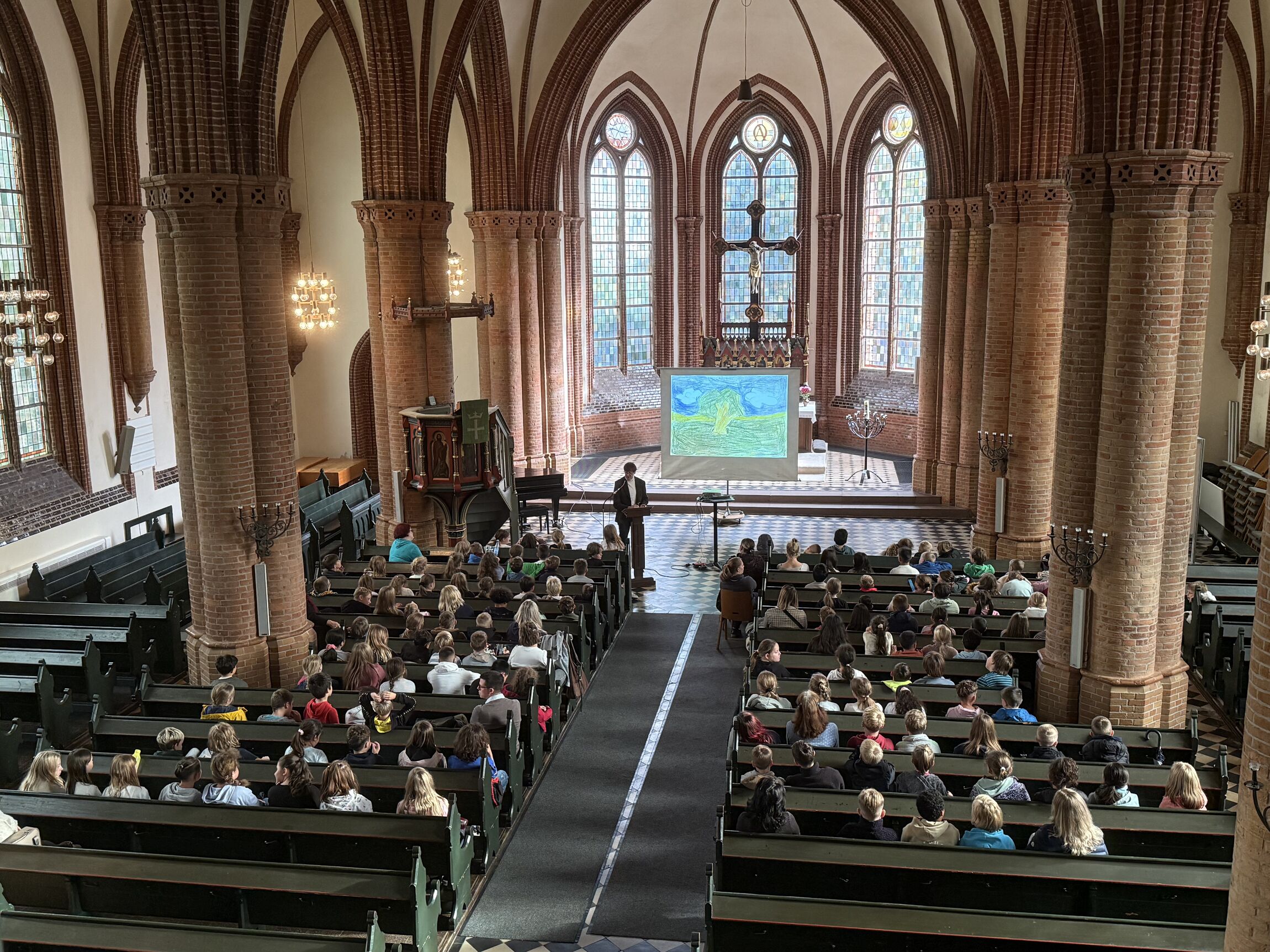 Im Mittelpunkt der Geschichte „Die Kirschin Elfriede“ steht die gleichnamige Kirsche, die die Welt erkunden möchte und sich auf ihrer Reise in den Mond verliebt, den sie mit Hilfe der Wolke Marie Claire zu erreichen versucht. Jede der Hauptpersonen hat ihr eigenes musikalisches Thema, das von der Orgel vorgetragen wurde. Die Kinder hatten nicht nur die Bilder zur Geschichte, die auf einer Leinwand im Altarraum der Christuskirche gezeigt wurden, im Voraus selbst gemalt, sondern nahmen auch dankbar die Einladung an, sich an bestimmten Stellen mit der eigenen Stimme an der Geschichte zu beteiligen. Die große Bandbreite der Orgel wurde deutlich, indem nicht nur die fröhlichen Elemente, sondern auch die düsteren Elemente der Geschichte musikalisch dargestellt wurden. Zum Schluss applaudierten die Kinder mit Begeisterung. So hat das Orgelkonzert deutlich gezeigt, dass Orgelmusik wirkt.
