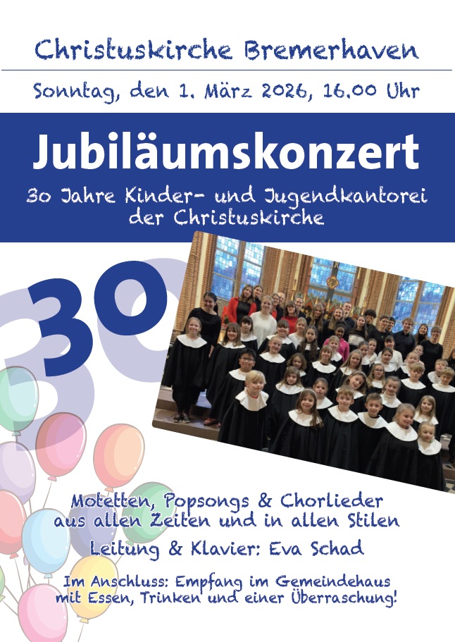 Vor 30 Jahren hat Eva Schad, damals neu als Kreiskantorin in Bremerhaven, einen Kinderchor gegründet. Dieser ist über all die Jahre gewachsen und besteht nun heute aus 5 unterschiedlichen Gruppen, nach Altersstufen gestaffelt und 75 Teilnehmern. Die kleinsten Kinder beginnen in der Kinderchorgruppe für Kitakinder und Erstklässler oft schon mit 3 Jahren und wachsen dann im Chor zu immer besseren Sängerinnen und Sängern heran. So durchschreiten die Kinder und Jugendlichen im besten Fall alle Gruppen bis zum Jugendchor der Oberstufe. Einige Sängerinnen treffen sich sogar noch in der Jugend-Kantorei, die aus 15 ehemaligen Chorsängerinnen besteht. Die jungen Damen zw. 21 bis 35 Jahren sind z.T. sogar Gründungsmitglieder und treffen sich projektweise immer noch in Bremerhaven, um zusammen im Chor zu singen. Die Gemeinschaft ist über die vielen Jahre gewachsen. Dazu tragen auch die regelmäßigen Chorfreizeiten in Drangstedt und die Chorkonzertreisen nach Spiekeroog, Leipzig, Stockholm, Madrid und Südafrika bei. Sowohl die gemeinsamen Konzerte schweißen zusammen als auch Nachwanderungen, Spiele und Lagerfeuer tragen zum intensiven Zusammenhalt bei. Vor 15 Jahren gründete Eva Schad sogar einen eigenen Knabenchor, aus dem die heutigen Männerstimmen des Jugendchores hervorgegangen sind. So singen die Jugendlichen schon seit vielen Jahren mindestens gemischt vierstimmig mit Frauen- und Männerstimmen. Mit dem Konzert am 1. März feiert die Kinder- und Jugendkantorei ihr 30-jähriges Bestehen. Abwechslungsreiche Chorarrangements aus Klassik, Romantik, zeitgenössisch und Pop mit allen 75 Kindern der Kinderchöre bis hin zur Jugend-Kantorei sorgen für ein kurzweiliges Konzert. Eingeladen sind auch alle ehemaligen Chormitglieder der letzten 30 Jahre, die gerne mitfeiern wollen. Mit den angemeldeten Gästen und den aktiven Chormitgliedern zusammen wird ein aus über 90 Sängerinnen und Sängern bestehender Chor gebildet. Mit einer Probe am Sonntag vorweg werden die Highlights der letzten 30 Jahre einstudiert. Es werden Kinder und Jugendliche zw. 4 bis 37 Jahren gemeinsam musizieren und das Jubiläum musikalisch genießen.
