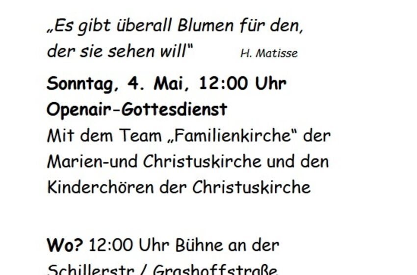 Auch in diesem Jahr feiern wir wieder einen Open-Air-Gottesdienst auf dem Blütenfest: am Sonntag, 4. Mai, um 12 Uhr auf der Bühne an der Schillerstr./Grashoffstr. Feiern wir gemeinsam einen ...